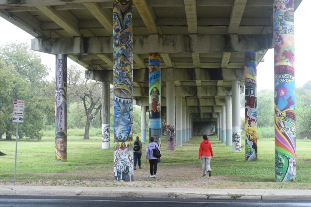 One of the inspiring partnerships we learned about was the Dolores Duffie Recreation Center Pillars Project. This project aligned a partnership between community art organizations, philanthropic donors, and a bridge agency. Artists from communities along Austin’s EastLink Trail created murals celebrating the histories of communities along the trail. It was visually beautiful and meaningful as the murals reflected the local community’s past, present, and future.